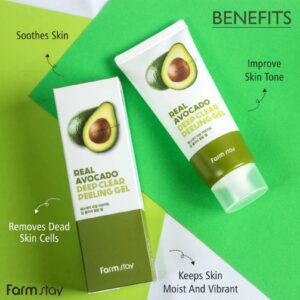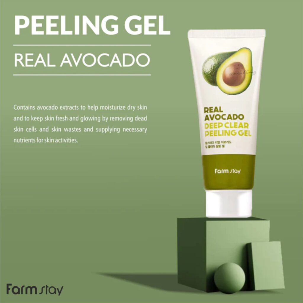Farmstay Real Avocado Deep Clear Peeling Gel Exfoliate then Calm your Skin Contains avocado extracts to help moisturize dry skin and to keep skin fresh and glowing by removing dead skin cells and skin wastes and supplying necessary nutrients for skin activities